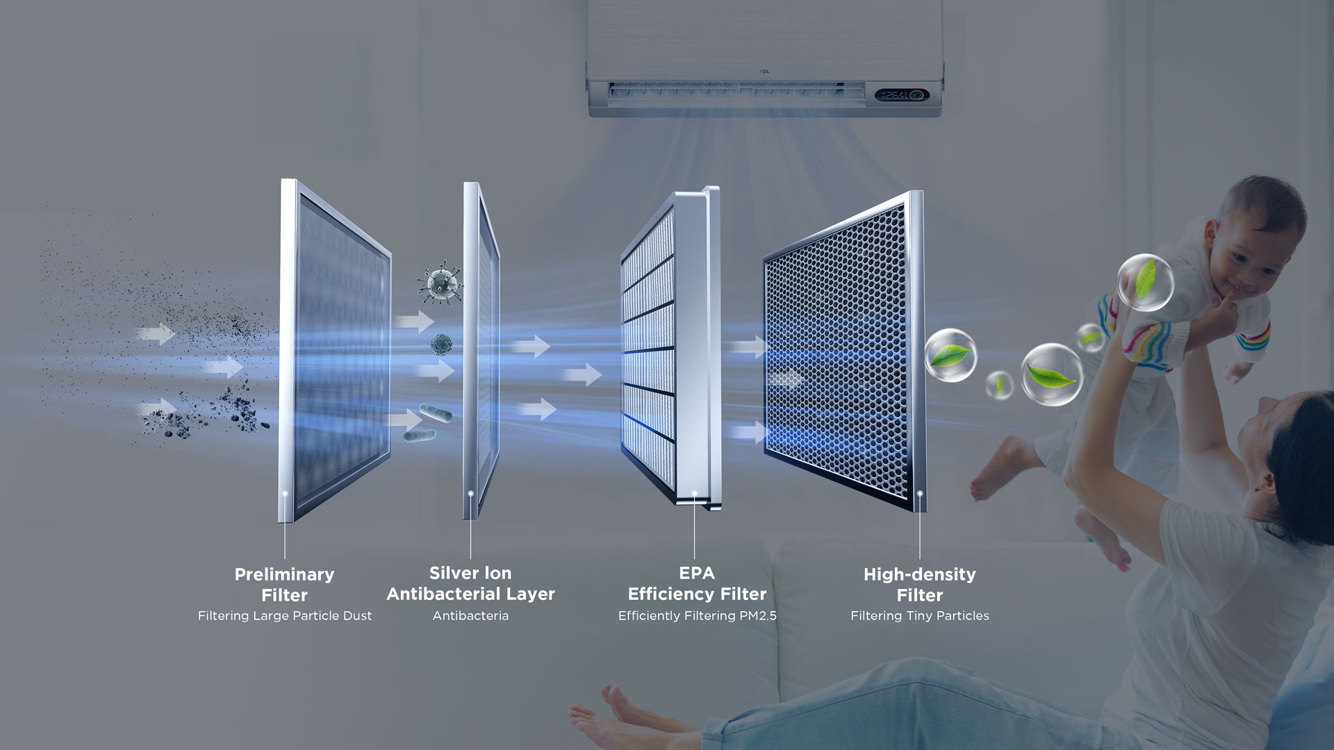 Пресният въздух ще преминава през четворни пречиствателни филтри, включително предварителен филтър, антибактериален слой със сребърни йони, EPA ефективен филтър и филтър с висока плътност, за да се осигури ефективно пречистване на въздуха.
